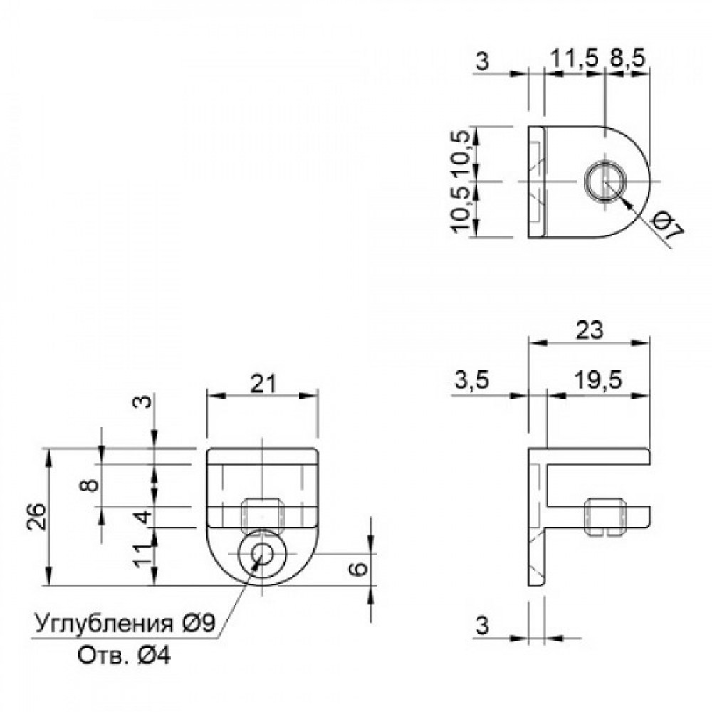 Практично нічим не відрізняються від звичайних полицетримачів скла, мають можливість регулювання для кріплення скла різної товщини, але в більшості випадків, обладнані гумовими насадками в місці затиску скла.