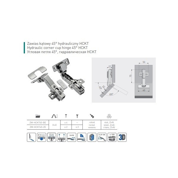 Кутова петля 45 ° означає, що стулка дверцят може відкриватися під кутом 135 ° до стінки меблів. Дозволяє плавно і беззвучно закрити стулку будь-якого елементу інтер'єру. Гарантує презентабельний зовнішній вигляд.