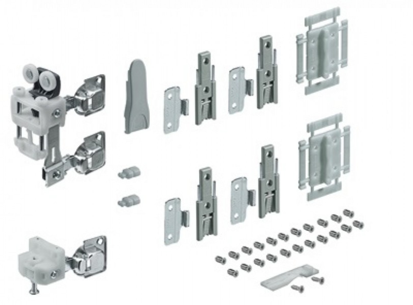 1 ходовий елемент, макс. 25 кг з функцією самозачинення; 1 направляючий елемент з функцією самозачинення; 4 петлі для складних дверей; 2 розмічальних шаблону для середніх петель; 1 кришка для ходового елемента; 2 амортизатора; 1 фіксатор для дверей.